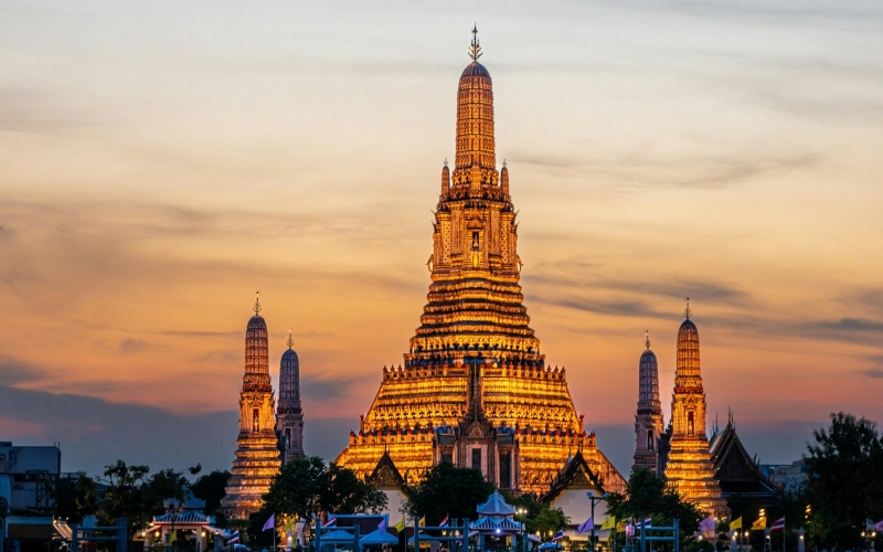 - Wat Arun còn có tên gọi khác là chùa Bình Minh. Vì mỗi buổi sáng, đây là nơi đầu tiên đón ánh sáng mặt trời mọc bên bờ sông Chao Phraya. Không chỉ là ngôi chùa với kiến trúc khảm sành sứ đặc sắc mà còn là ngôi chùa linh thiêng bậc nhất xứ sở chùa vàng Thái Lan.