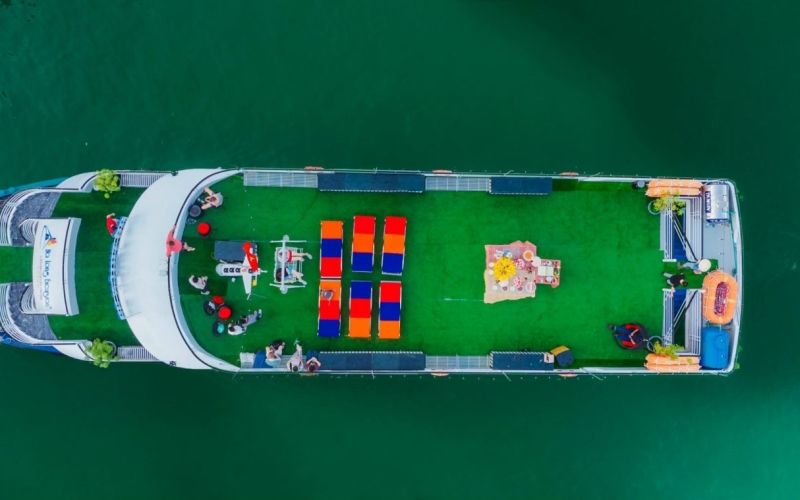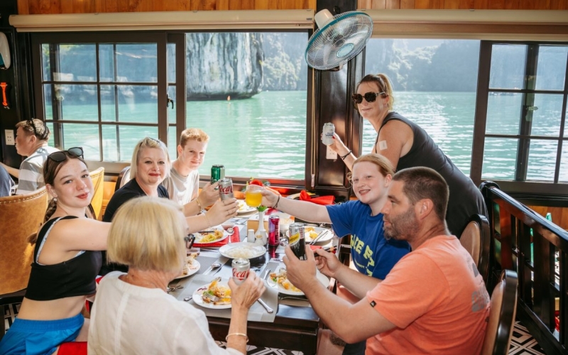 12:30 PM: Thưởng thức Bữa trưa tự chọn với hơn 30 món ăn trên tàu. Trong khi dùng bữa trưa, tàu sẽ đi qua cảnh đẹp hai bên bờ với hàng ngàn hòn đá vôi như Hòn Gà Chọi và Hòn Nếp Hương – 2 biểu tượng của Vịnh Hạ Long
