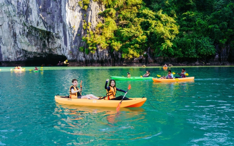 02:45 PM: Đi thuyền kayak hoặc thuyền tre qua Hang Luồn để khám phá đầm phá tuyệt đẹp.