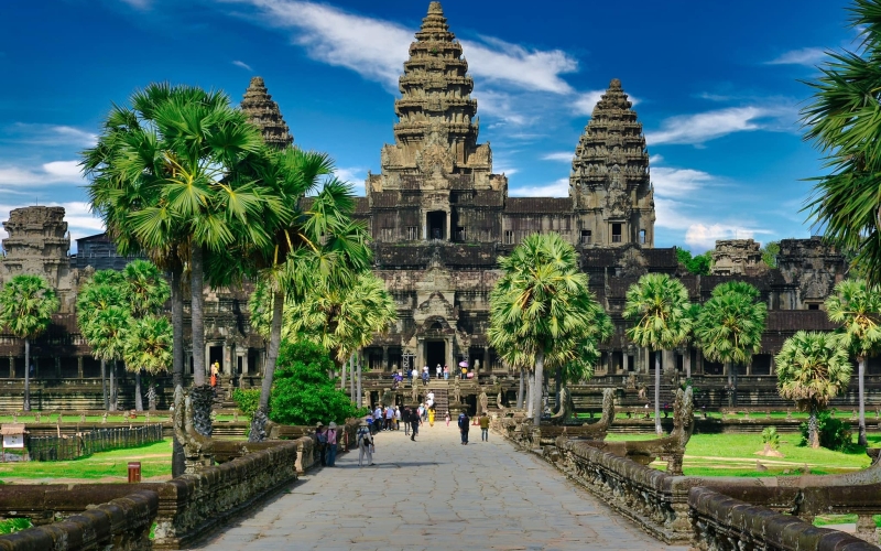 - Đền Angkor Wat “Di Sản Văn Hóa” của thế giới, thiêng liêng bậc nhất ở Cambodia. Đền Angkor Wat được vua Suryavarman II xây dựng vào nửa đầu thế kỷ XII. Diện tích của cả quần thể kéo dài hơn 248 dặm vuông (400 km2), chạy bao quanh đền là một hào nước sâu và rộng. Với thiết kế ban đầu được xây dựng để thờ Hindu giáo nhưng sau này do sự du nhập và phát triển mạnh của đạo Phật, Angkor Wat đã chuyển sang thờ Phật giáo.